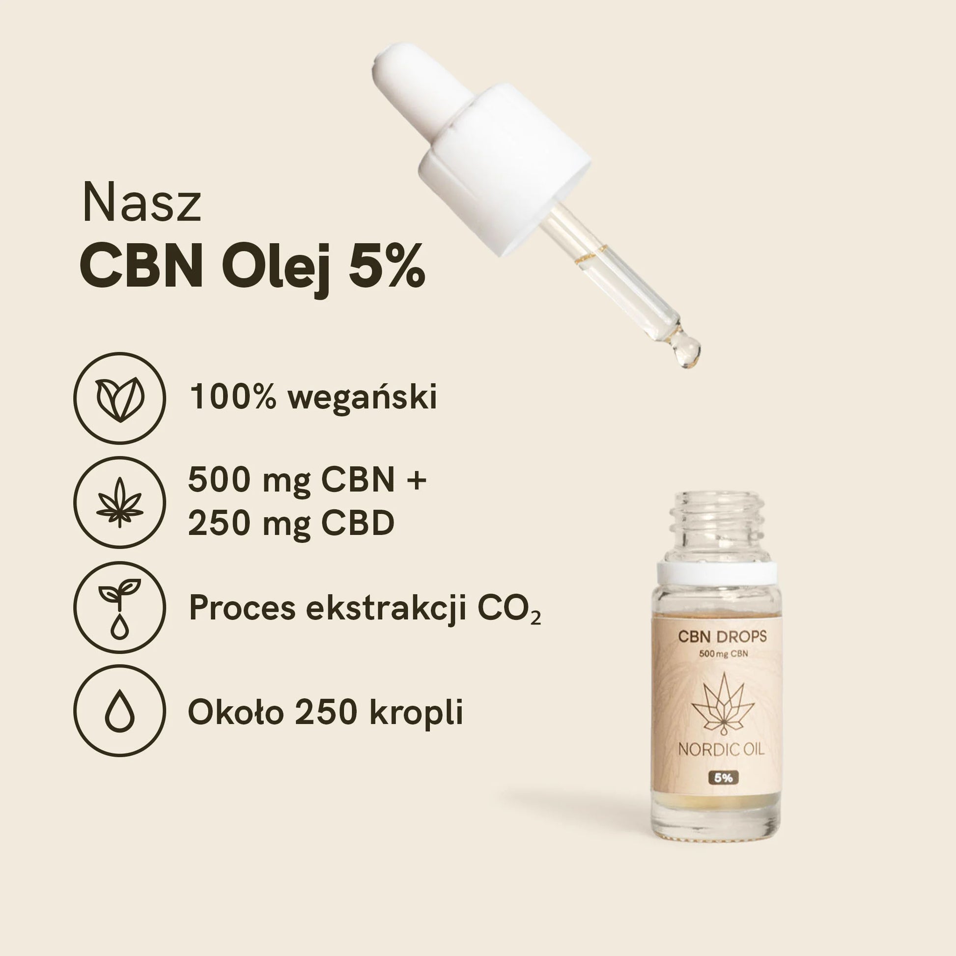 - Zawiera około 250 kropli (2 mg CBN na kroplę)