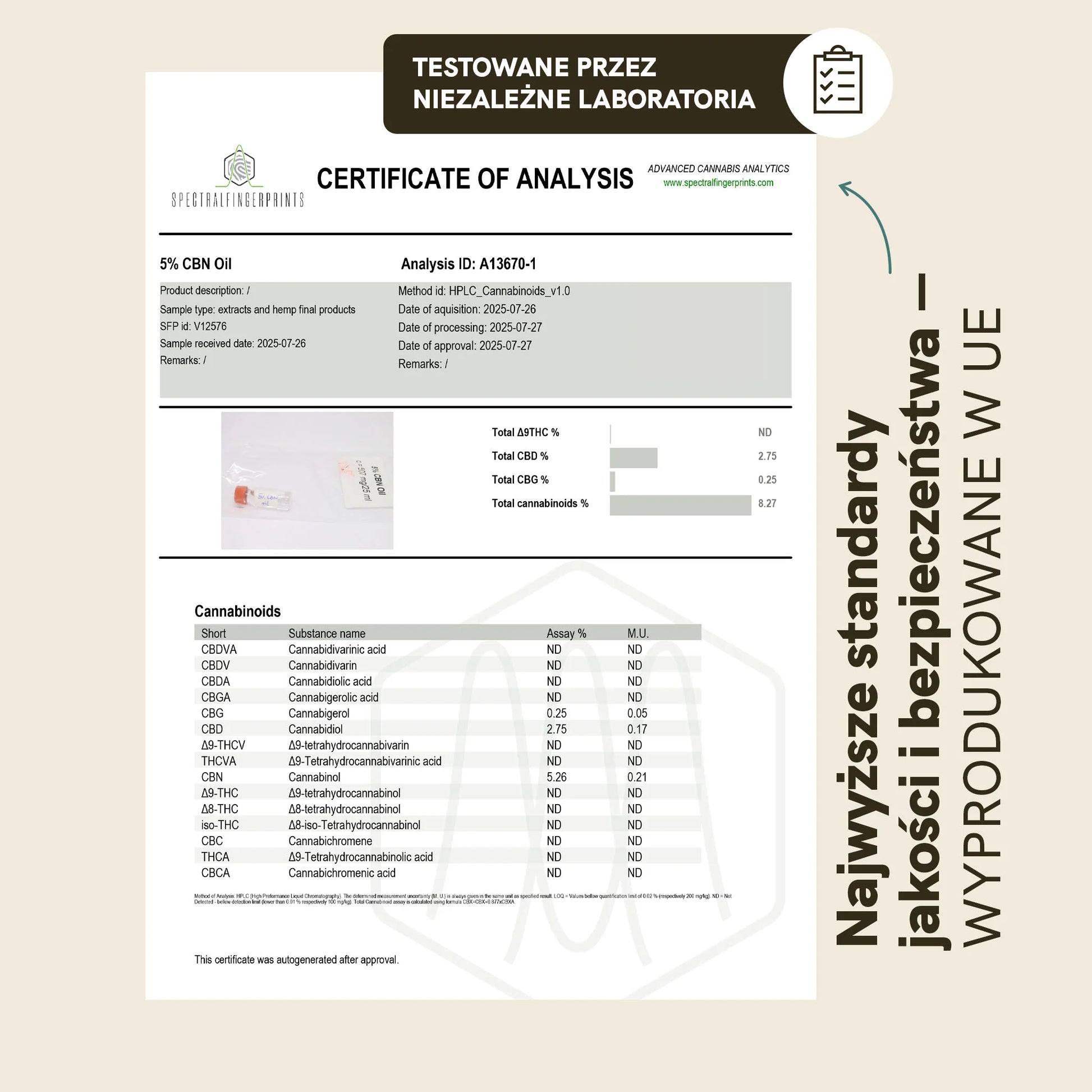 Olej CBN jest idealnym rozwiązaniem dla osób poszukujących głębokiego, spokojnego snu bez porannego uczucia zmęczenia. Zawiera skuteczną mieszankę 500 mg CBN i 250 mg CBD, połączoną z organicznym olejem MCT jako bazą. Każda butelka zawiera około 250 kropli, dostarczając 2 mg CBN w każdej kropli, co pozwala na precyzyjne dopasowanie dawki do indywidualnych potrzeb. Opracowany jako ekstrakt szerokiego spektrum, zawiera naturalnie występujące kannabinoidy, terpeny oraz przeciwutleniacze w postaci witaminy E — bez zawartości THC. Produkt powstaje w delikatnym procesie ekstrakcji, który pozwala zachować wartościowe związki z konopi, wspomagając wieczorne wyciszenie i relaks.