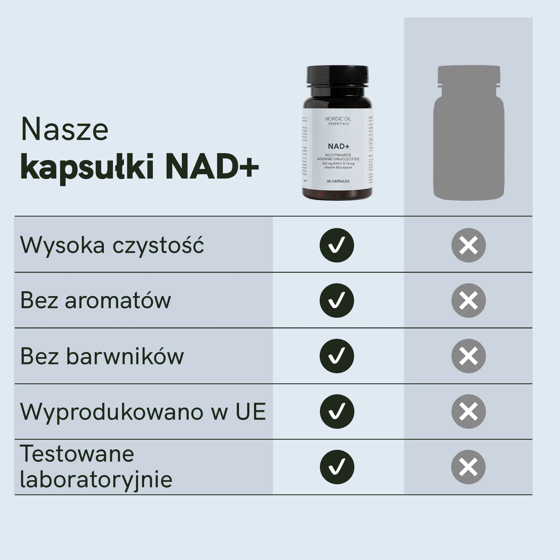 Kapsułki z nikotynamidoadeninowym dinukleotydem (NAD+) firmy Nordic Oil zawierają dwa silnie działające składniki: 300 mg NAD+ i 16 mg nikotynamidu (witaminy B3) w każdej kapsułce.