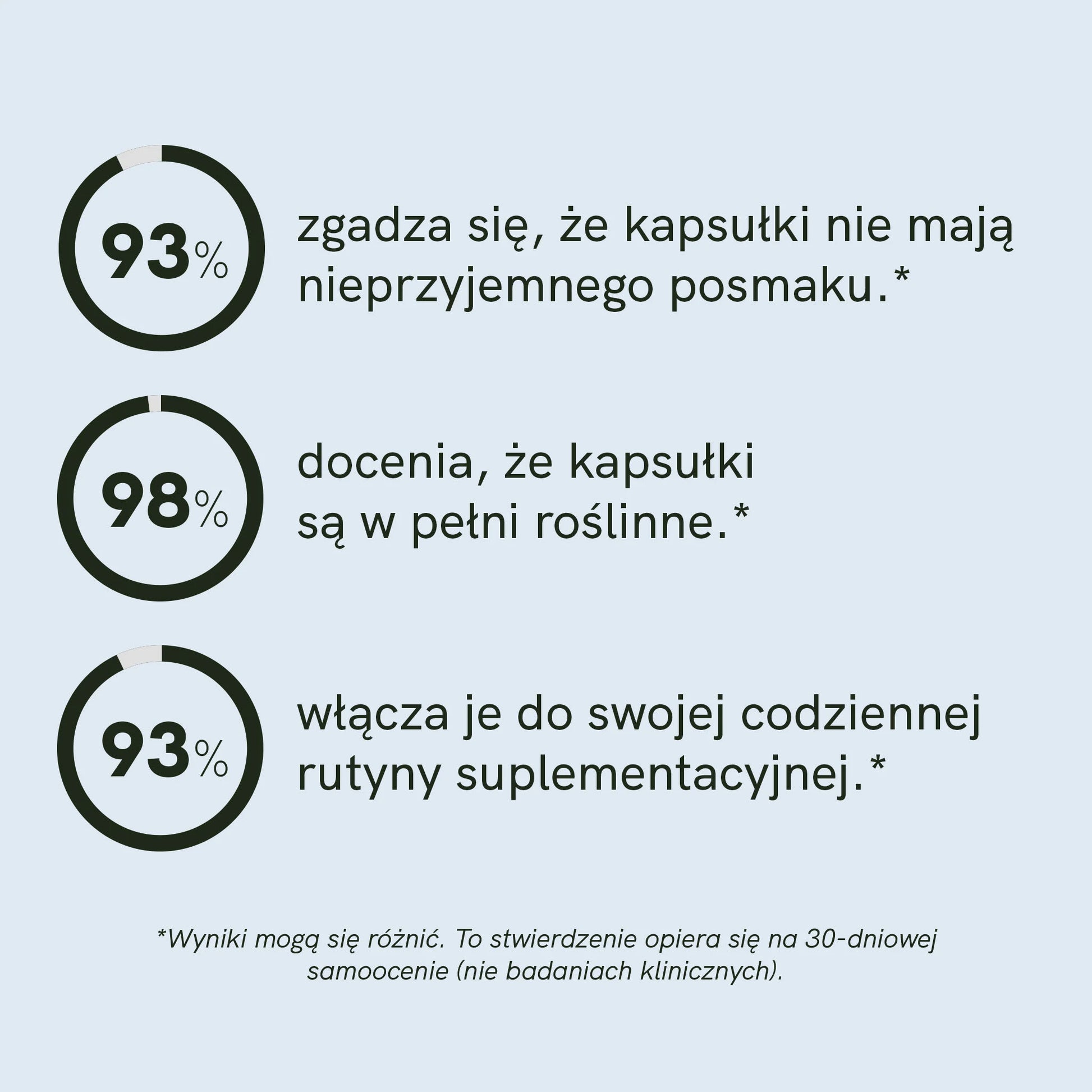 Kapsułki produkowane są w UE, są bezglutenowe, bez oleju palmowego, wegańskie i testowane laboratoryjnie. Stabilizowane naturalnymi ekstraktami tokoferolu i rozmarynu dla najwyższej czystości i jakości.