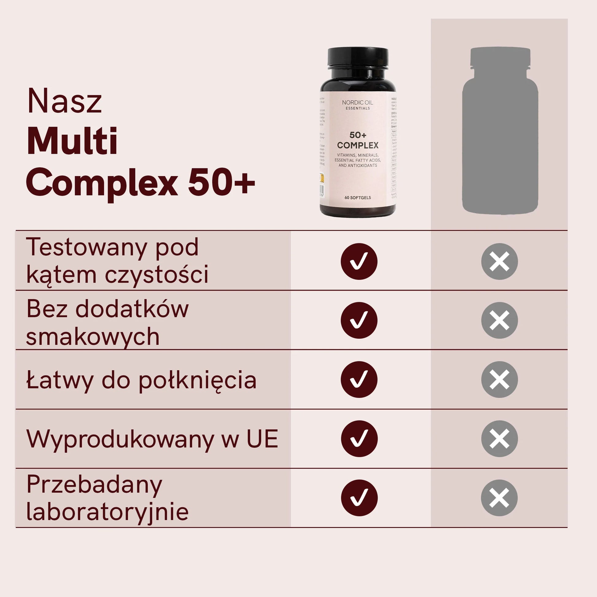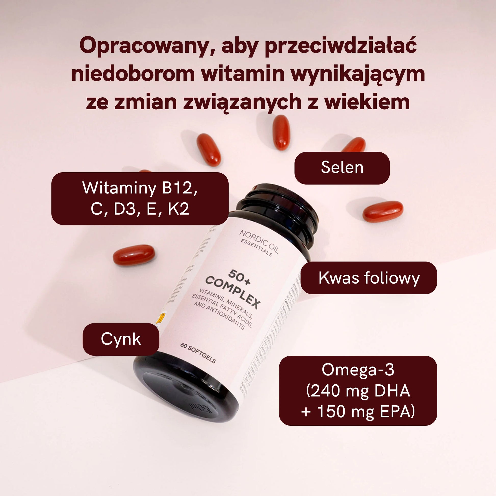 Wraz z wiekiem organizm trudniej przyswaja i wykorzystuje składniki odżywcze, co sprawia, że witaminy i minerały stają się jeszcze bardziej istotne. Kapsułki Multi Complex 50+ są naukowo zbilansowane, aby sprostać tym wyzwaniom, zapewniając odpowiednie wsparcie odżywcze dla osób po 50. roku życia.