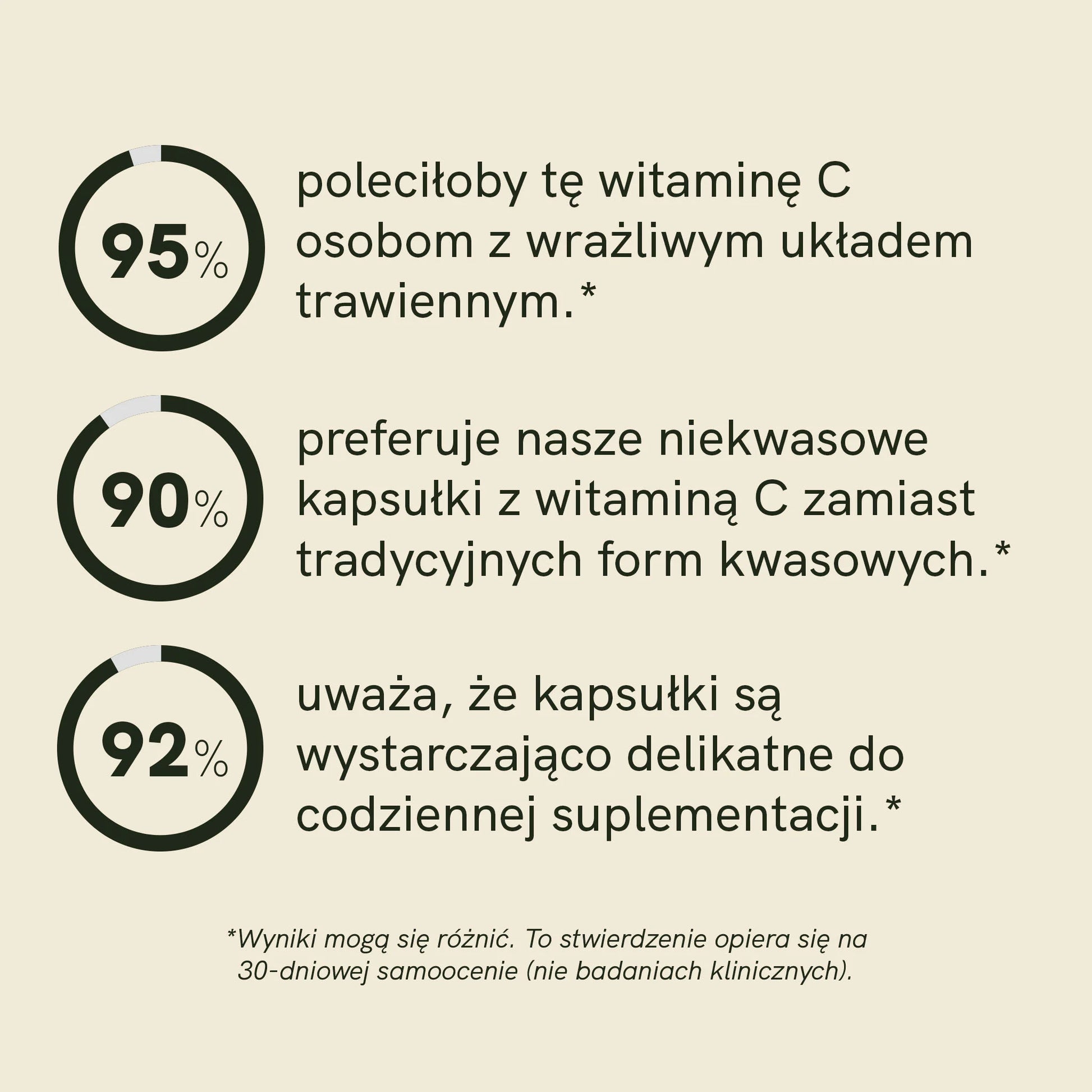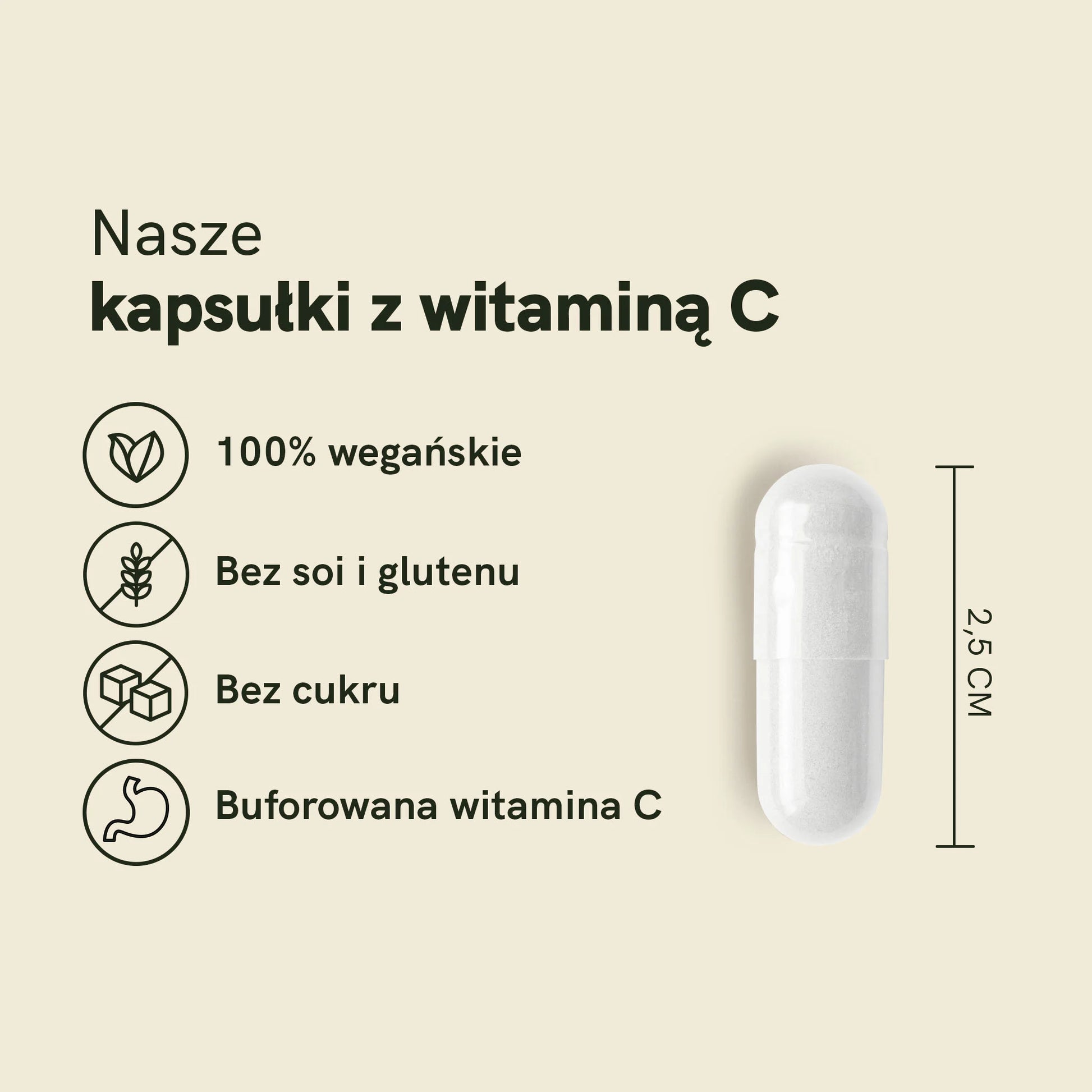 Nasze kapsułki z wysoką dawką witaminy C zapewniają delikatne wsparcie, szczególnie w okresie zimowym. Wyprodukowane z askorbinianu wapnia, niekwasowej formy witaminy C, kapsułki są łagodne dla żołądka, co czyni je idealnymi nawet dla osób z wrażliwym układem trawiennym. Każda butelka zawiera 120 wegańskich kapsułek, opracowanych bez glutenu, laktozy, cukru czy sztucznych dodatków.