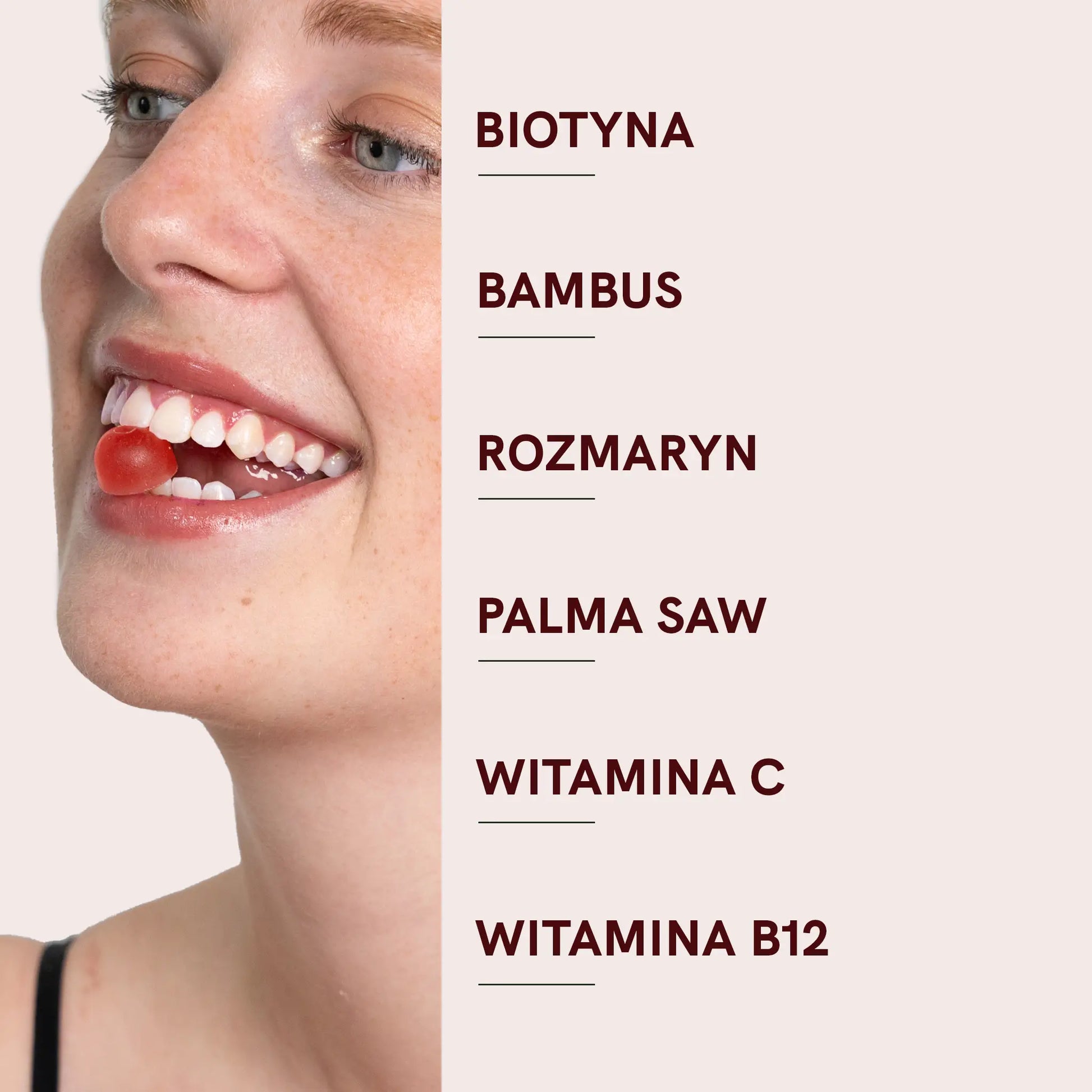 Każde opakowanie zawiera 60 wegańskich żelków, starannie wyprodukowanych w UE i całkowicie wolnych od cukru. Formuła łączy witaminy znane z roli w utrzymaniu zdrowych włosów, skóry i paznokci z silnymi ekstraktami roślinnymi, takimi jak acerola, bambus i rozmaryn.